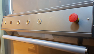 Piattaforma senza porte di cabina e con manovra a uomo presente, sia in partenza che durante la marcia l’operatore deve tener sempre premuto il pulsante del piano desiderato.