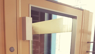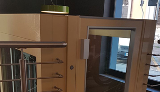 Piattaforma munita di porte di cabina automatiche o a soffietto che consentono il raggiungimento al piano desiderato premendo il pulsante di piano o di cabina come un normale ascensore.